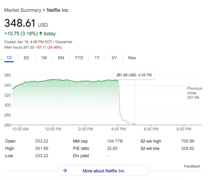 This loss of subscribers has already had a huge impact on Netflix’s stock. Analysts had been “bracing” for a report that indicated Netflix had a sluggish start to the year, but some still expected Netflix to add about 2.5 million customers. Now that this simply isn’t the case, the shares (which were already down about 40%) have dropped significantly. (Bloomberg)