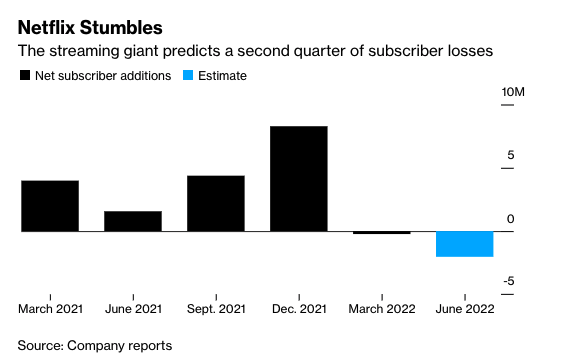 Additionally, Netflix pulled its service in Russia due to Russia’s invasion of Ukraine, which has cost them more subscribers. (Bloomberg)