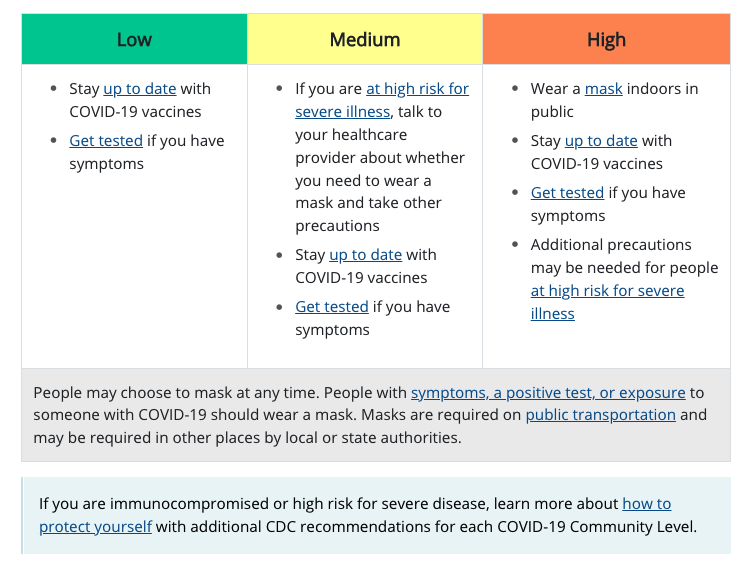 Also, keep in mind that the CDC does continue to recommend that individuals wear a mask indoors in public in areas where the community COVID-19 level is high.