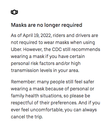 Uber also notes that individuals might feel more comfortable wearing a mask and to remember to be respectful of their preferences. Uber also notes that guest can cancel their trip if they feel uncomfortable.