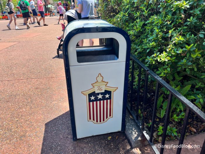 While we were strolling around World Showcase we spotted a new trash can in the American Adventure. This trash can doesn’t have flaps, so you can throw something away without having to touch the trash can itself.