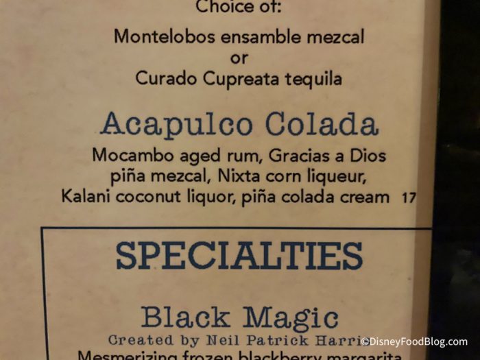 There are two new drinks at La Cava Del Tequila in the Mexico pavilion! The first is the Acapulco Colada which is Mocambo aged rum, Gracias a Dios piña mezcal, Nixta corn liquer, Kalani coconut liquor, and piña colada cream. It is $17.