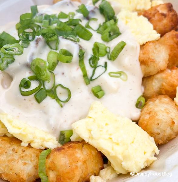 You can find the adult Breakfast Bowl at Woody’s Lunch Box ( in Toy Story Land in Disney’s Hollywood Studios) for $8.79. The bowl is packed with potato barrels, smothered in smoked brisket, scrambled eggs, and country gravy. The finishing touch is the green onion garnish on top. A kid’s version is also available for $5.49.