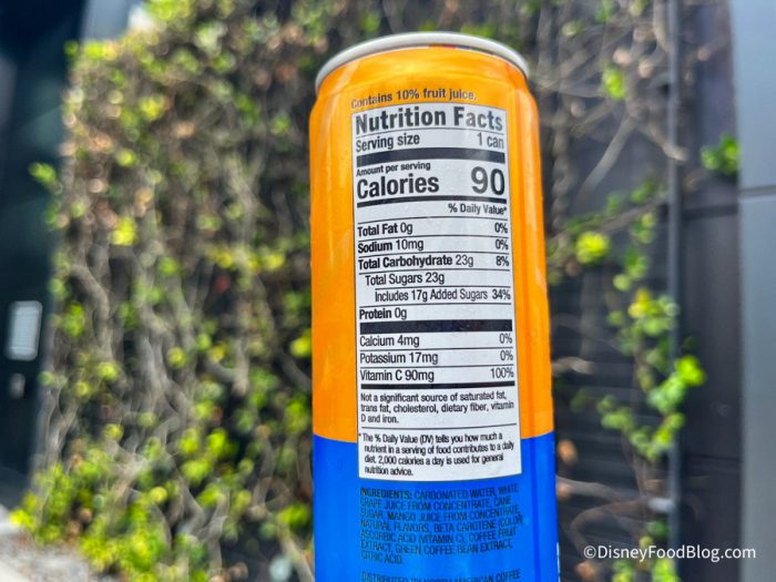 We found the Mango Guava Baya Energy drink flavor in Disney Springs. It is sparkling mango guava juice with caffeine added to it to create a refreshing fruity energy drink.