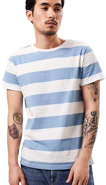 We’re heading to Neverland for our next park-ready DisneyBound option. This Smee-inspired look is a simple, casual ensemble that you can put together pretty easily! First, you’ll need a blue stripe t-shirt.