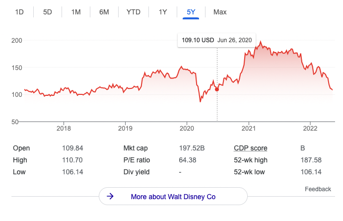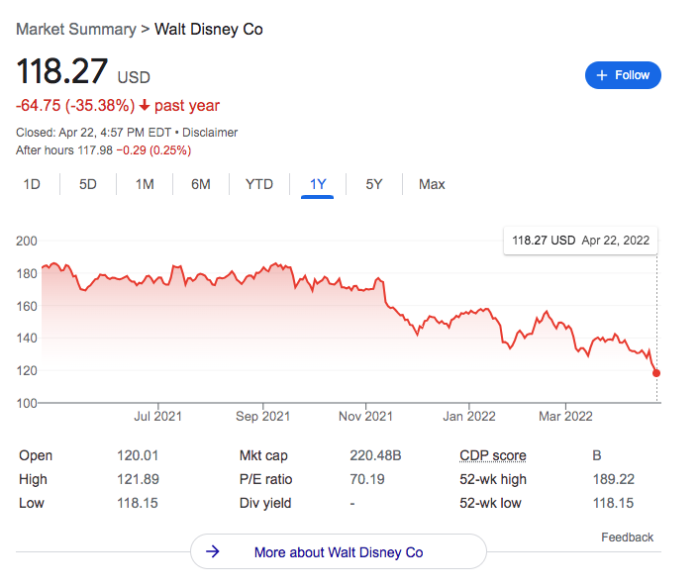 UPDATE: Disney stock values have continued to drop. As of May 10th, 2022, the stock was trading at around $108.49.