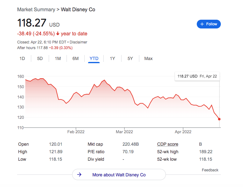 Bloomberg noted that these troubles with Netflix could cause investors to “question whether the later-arriving media companies will sign up enough customers to justify all the money they are spending on fresh programming.” Disney stock and others fell a bit during that time as well. At that point (on April 19th) Disney stock was trading at around $124.98 after hours.