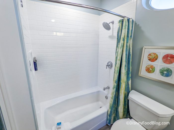 The shower is nice and spacious! Guests can use the Disney-provided soap, or bring their own; there’s a small shelf build into the shower for extra shampoos.