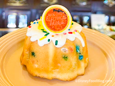 One of the new food items you can find in Disneyland specifically for the return of the Main Street Electrical Parade is the Parade Confetti Bundt Cake at Plaza Inn! This treat costs $5.99, and is a confetti cake with blue sopapilla filling, cream cheese glaze, with decorations for the Main Street Electrical Parade.