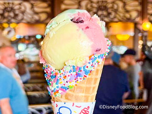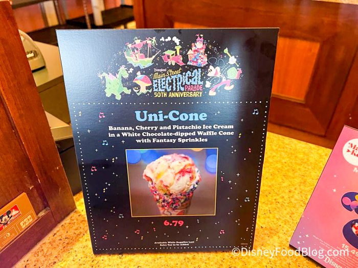 Gibson Girl Ice Cream Parlor on Main Street, U.S.A. released a new treat to celebrate the return of Nighttime Spectaculars, and it’s very unique! The new Uni-cone has banana, cherry, and pistachio ice cream in a white-chocolate dipped waffle, topped off with fantasy sprinkles! The Uni-Cone costs $6.79.