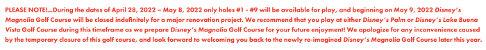 According to Walt Disney World’s Golf site, Disney’s Magnolia Golf Course will be closed indefinitely for a “major renovation project” beginning May 9th, 2022. Leading up to this only holes #1 – #9 will be available for play from April 28th to May 8th, 2022.