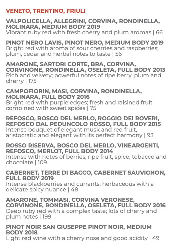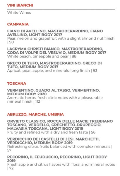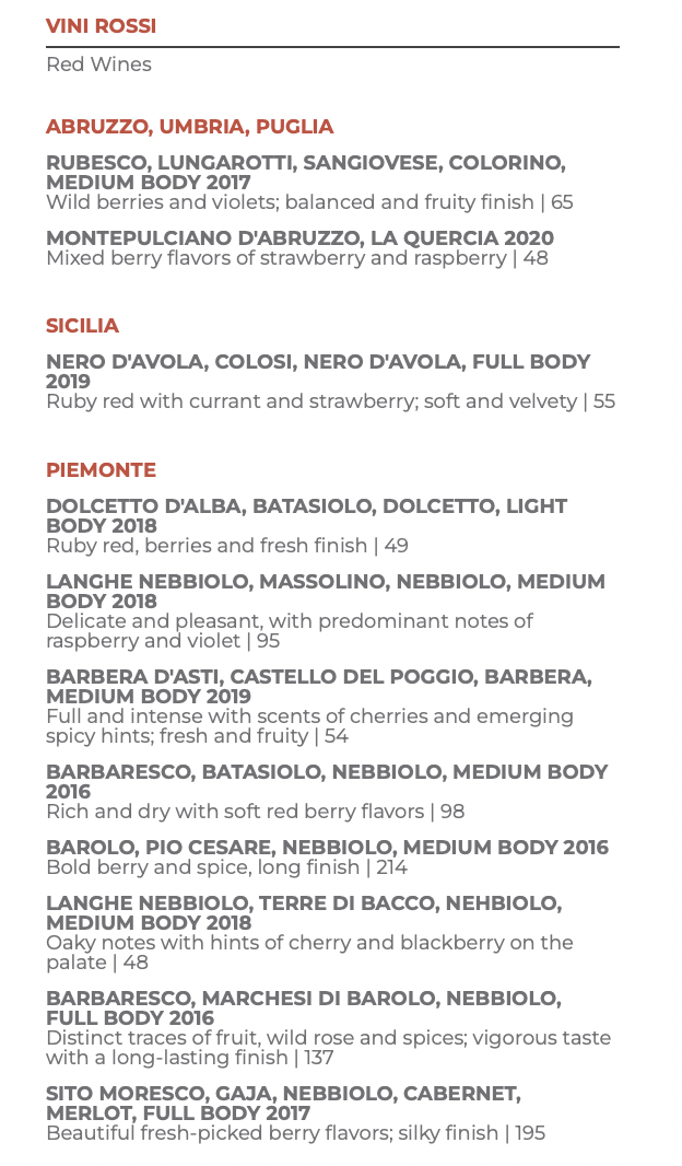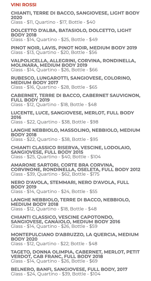Speaking of wine, there is a HUGE list at Tutto Gusto! First up, we have wines by the glass: