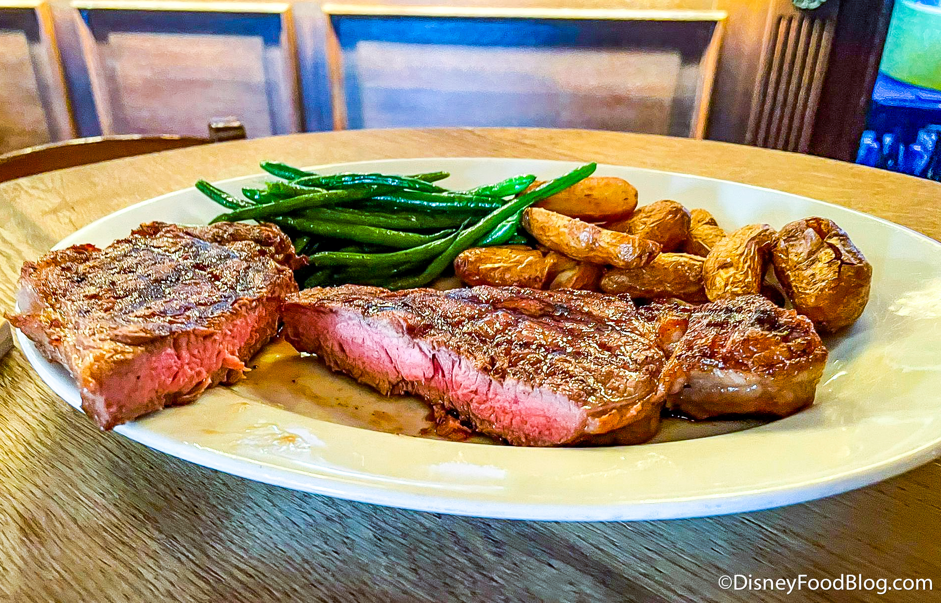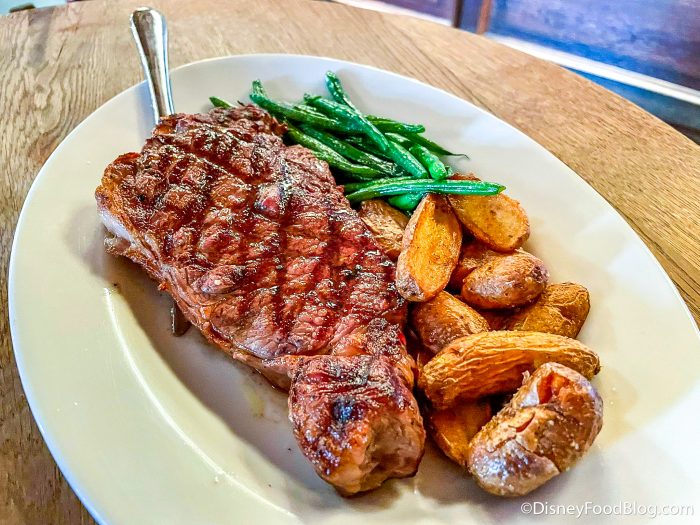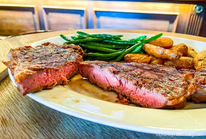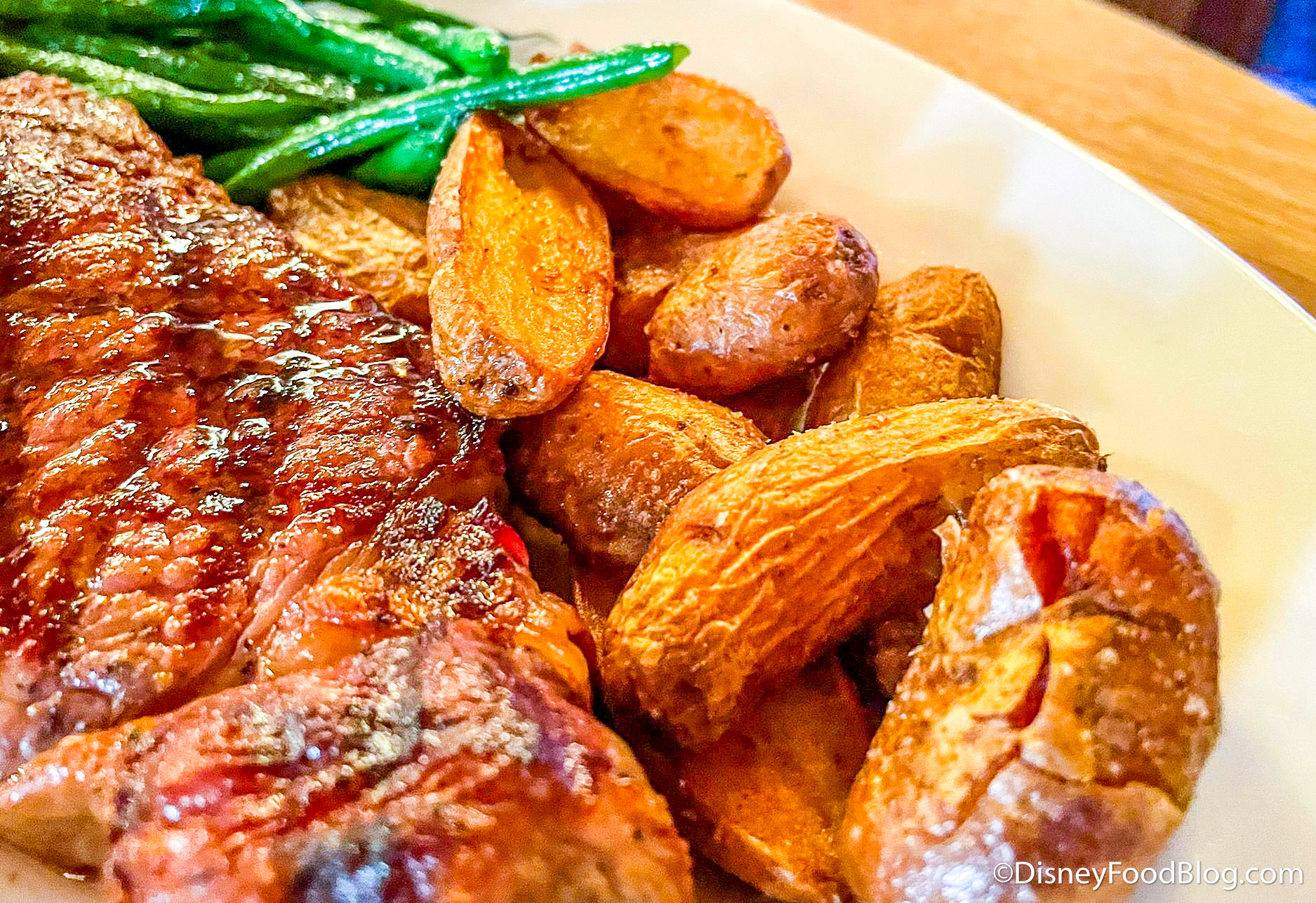 But, this wasn’t the most tender steak we’ve had on Disney World property! That would probably belong to a restaurant like Jiko or Le Cellier. However, that is to be expected since this is NY strip steak instead of something like a filet (we still think it could’ve been a little more tender, though!).