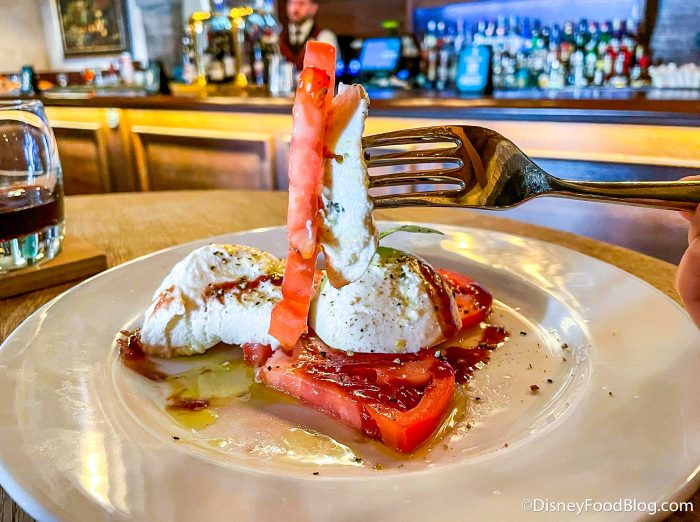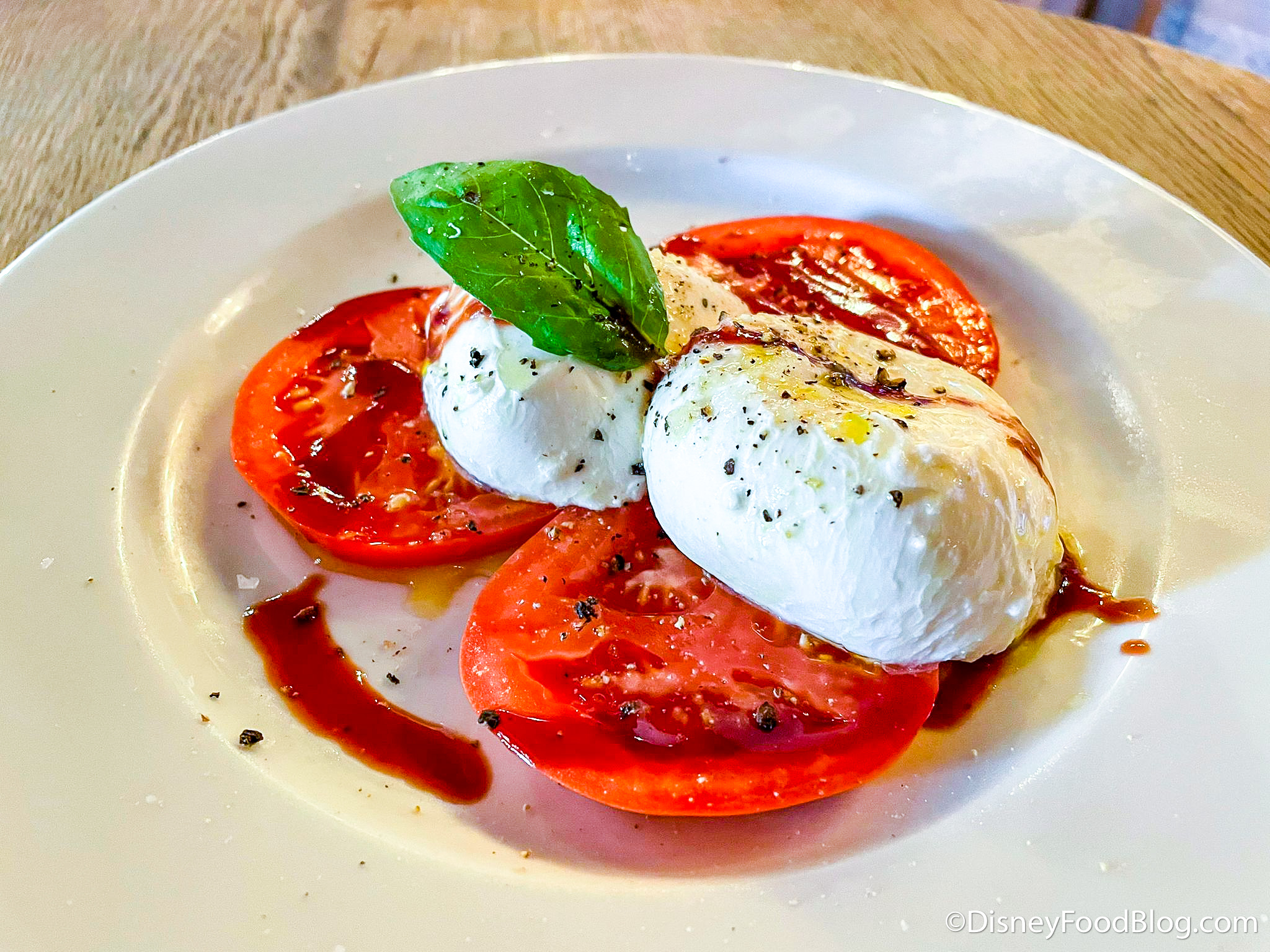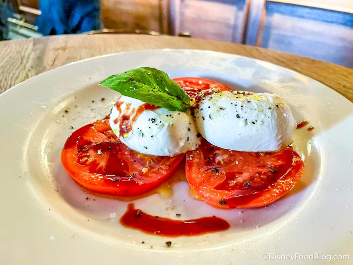 We think this is the perfect appetizer for a hot day in the parks! The mozzarella is super fresh and creamy. The large tomato slices are refreshing as well and have a nice bite to them, they weren’t mushy at all.