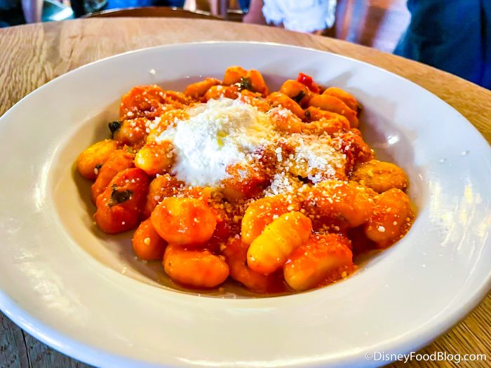 We couldn’t go to the Italy pavilion without getting pasta, right? Of course not! So, next we got the Gnocchi Sorrentina for $29. This has potato dumplings, roasted tomatoes, Pomodoro sauce, and burrata cheese. This gnocchi was very tasty, but beware that it can be more dense than typical pasta and a little heavier since it is made from potatoes.