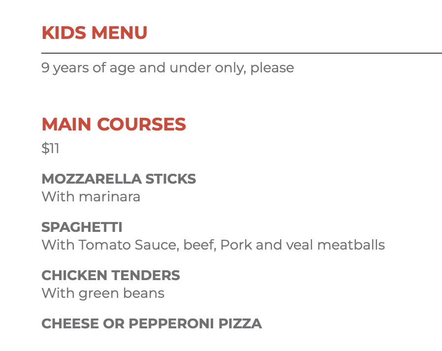 There is also a Kids’ Menu here with things like Mozzarella Sticks and Chicken Tenders.