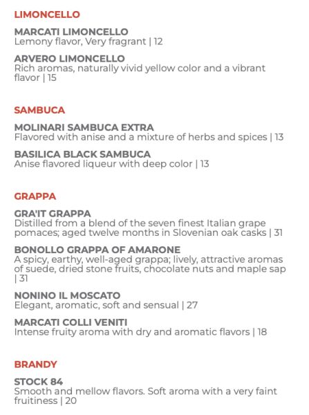 Next, are wines you can get by the half bottle, as well as some other spirits: