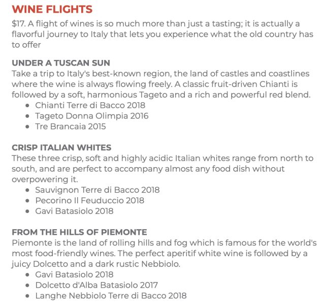 Then, we have a small list of wine flights available where you can get 3 samples of different wines for $17.