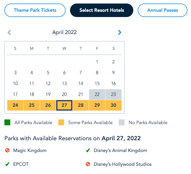 Incredi-Passholders won’t be able to visit Magic Kingdom OR Hollywood Studios next week as park reservations are currently sold out, though this can sometimes change. EPCOT is available from April 26th to 30th, and guests can still book Animal Kingdom on April 28th.