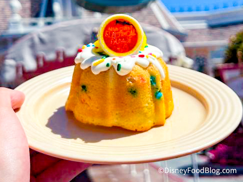 One more Main Street Electrical Parade snack, please! Check out the Parade Confetti Bundt Cake for $5.99! It is a confetti cake with blue sopapilla filling, cream cheese glaze, with decorations for the Main Street Electrical Parade.