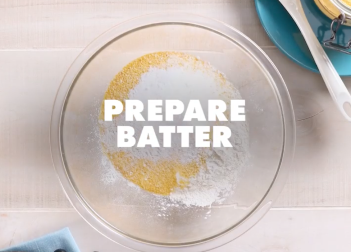 Next, prepare your batter by combining your flour, cornmeal, sugar, salt, baking powder, and baking soda. Whisk together, and then add in your buttermilk and eggs, and mix until combined.