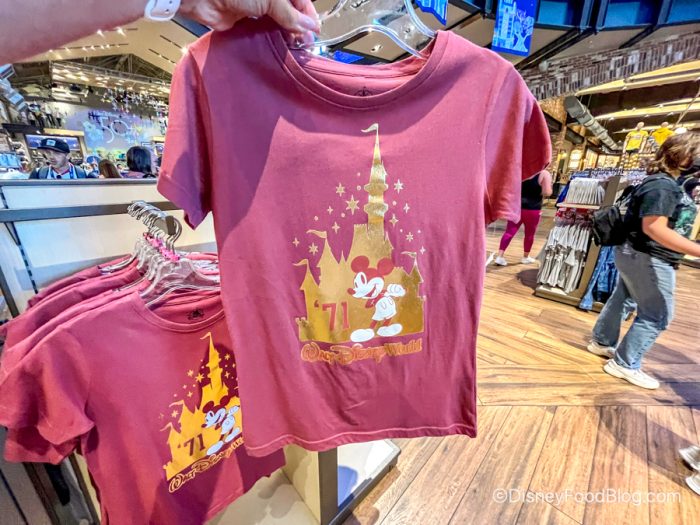 Celebrate Disney World’s 50th Anniversary with the new Gold Castle ’71 T-Shirt for adults. It features our main mouse in front of Cinderella Castle and is $36.99.