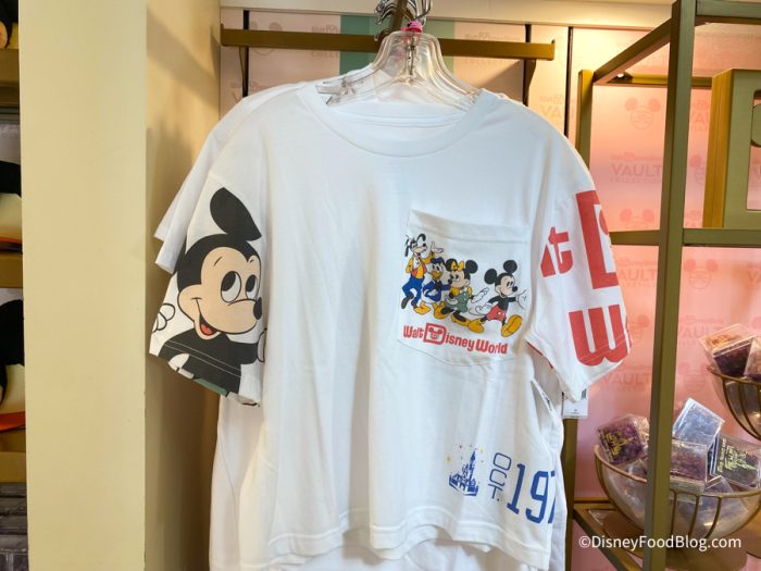 We also saw this shirt from the Vault Collection that has Mickey Mouse on one sleeve, the Walt Disney World logo on the other, along with Mickey, Minnie, Donald, and Goofy on the pocket.
