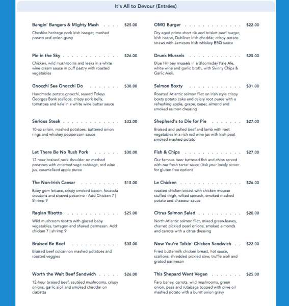From fish and chips to shepherd’s pie and all kinds of beer options, there are a lot of picks here that you won’t find at “standard” theme park spots.