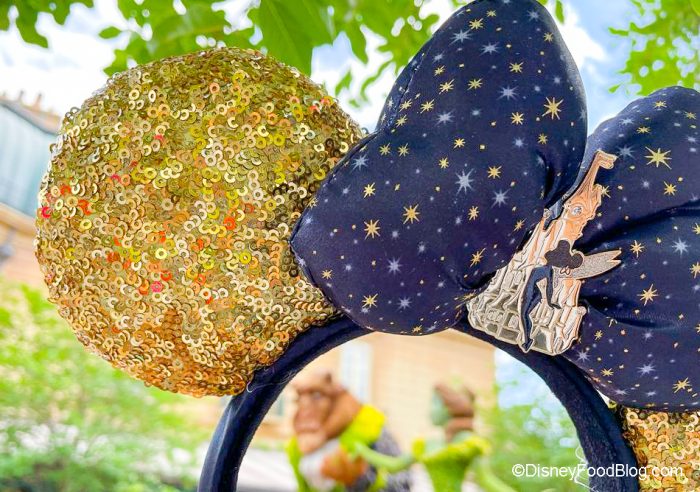We spotted the Disneyland Paris 30th-anniversary Minnie Ears! This pair features gold sequin ears, a navy blue bow, and a gold castle with Tinker Bell ✨