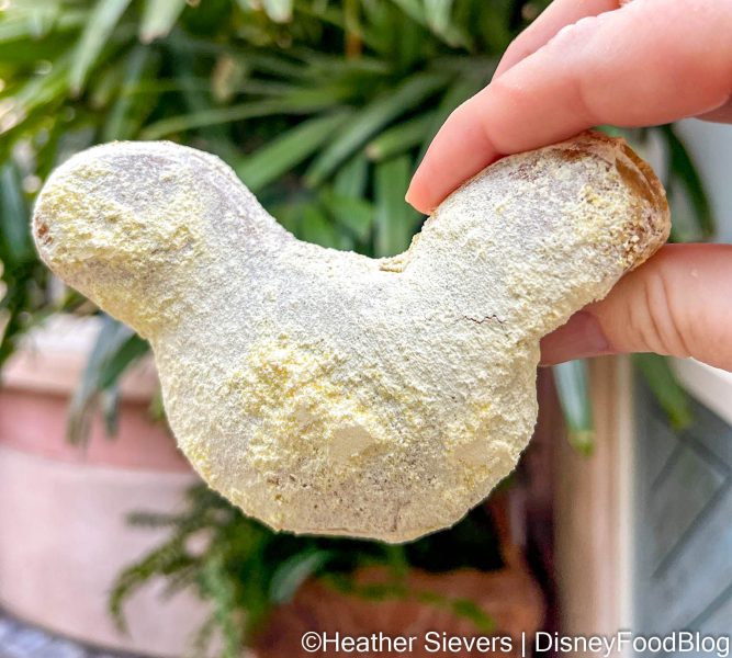 The newest flavor to the lineup is the Banana Mickey-shaped Beignets! They’re basically the regular Mickey Beignets, but they get their banana taste from being rolled in Banana Powdered Sugar. You can buy them in a 3-pack for $5.49, or a 6-pack for $8.99. And, we opted to add a side of Caramel Crème Anglaise Dipping Sauce for $0.99!
