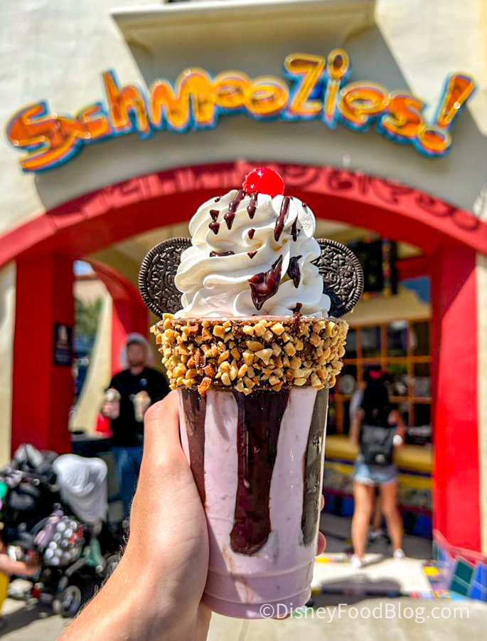 Next up we’ve got the Banana Split Mickey Mouse Shake! This photogenic Mickey-inspired treat is a strawberry-banana shake, with whipped topping, chocolate sauce, peanuts, and creme-filled chocolate cookies that make Mickey ears!
