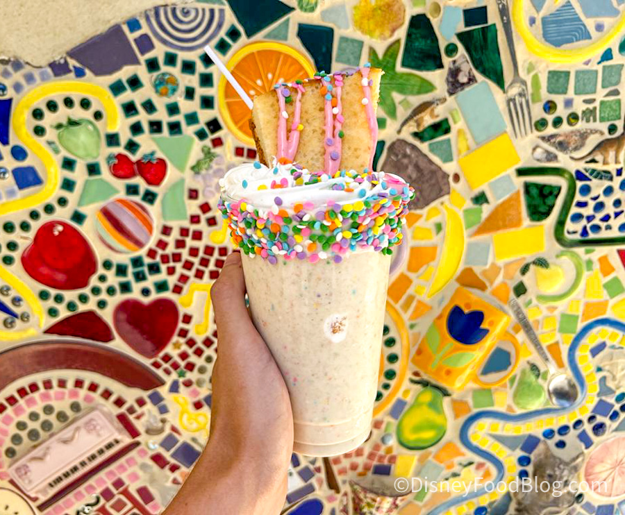 If a Confetti Cake Shake sounds a little over-the-top, we can confirm — it totally is, but true cake and shake connoisseurs won’t care one bit. This new shake is giving Black Tap Craft Burgers & Beer in Downtown Disney and Beaches and Cream in Disney World a run for their money as it’s a vanilla cupcake flavored shake with whipped topping and an ENTIRE slice of cake on top!