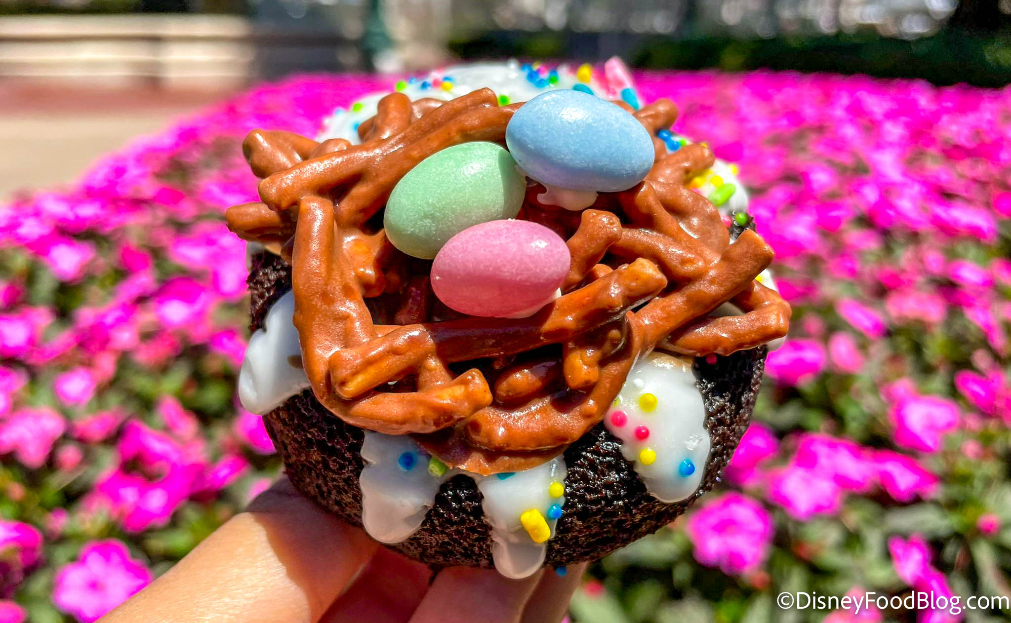 We visited Gasparilla Island Grill in Disney’s Grand Floridian Hotel & Spa to try two new Easter treats, including the Spring Birds Nest Donut for $5.79. While this treat is really cute, it wasn’t great. We were happy with the pretzels, the icing, and the chocolate eggs, but when it came to the donut…oh no.