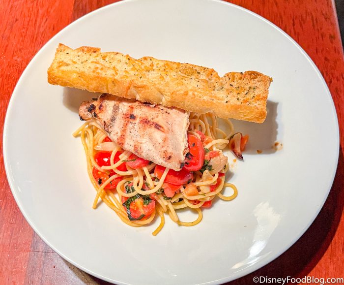 In Disney’s Hollywood Studios, we visited Mama Melrose to try Mama’s Italian Pasta with Chicken for $24. This dish comes with Chicken with Spaghetti tossed with Roasted Garlic, Tomato, Fresh Basil, and Asiago-Herb Crostini. It wasn’t terrible, but it was mostly just…okay.
