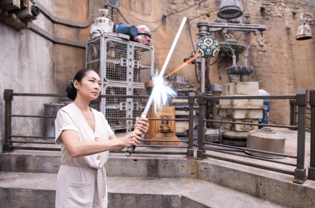 These are called Magic Shots, which is when special effects are added to your photo to enhance them! The next photo op is this Magic Shot, where you can practice your skills with The Force using this training droid!