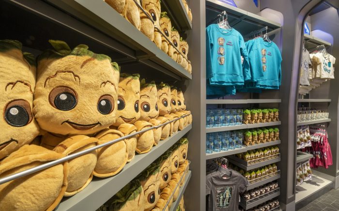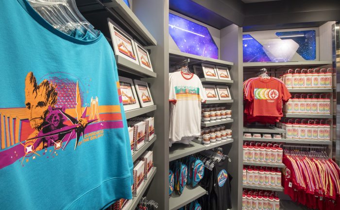 UPDATE: Thanks to a special Disney media event we were able to attend, we also now have an exclusive FIRST LOOK INSIDE the Treasures of Xandar gift shop! Looks like there will be some screens with special displays, more theming, jackets, and a whole bunch of other items.
