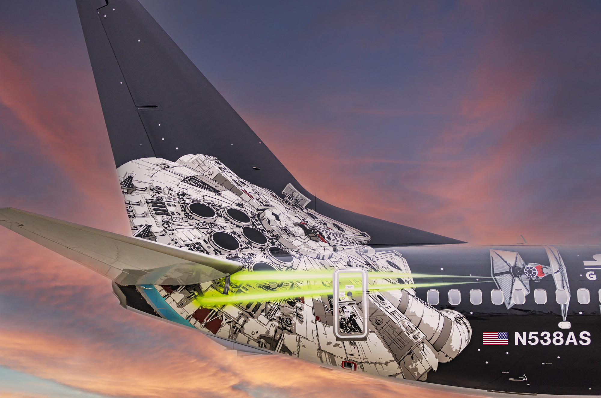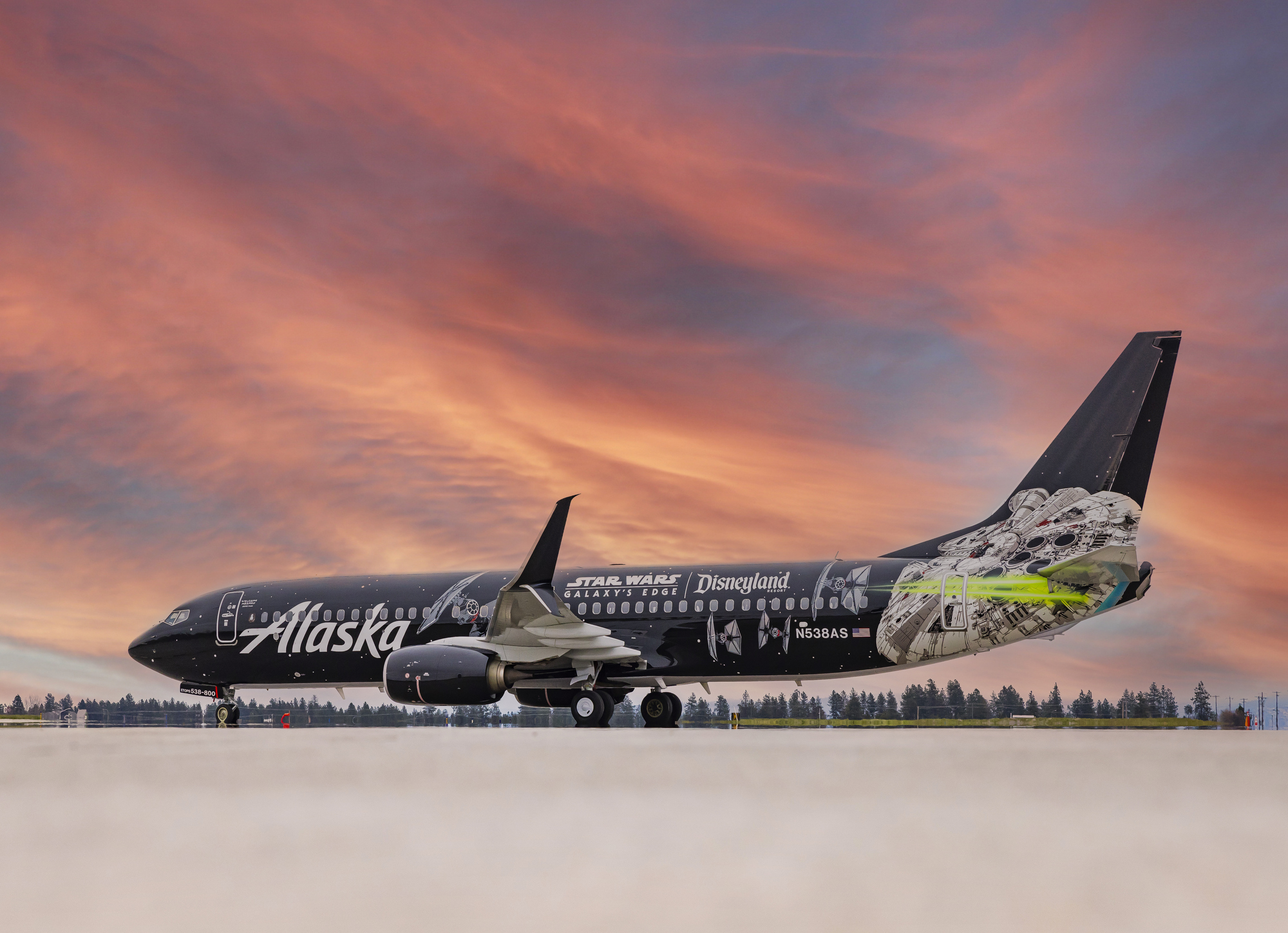 The aircraft was designed by teams at Alaska, Lucasfilm, and Disneyland, and with a “space black” painted background, it features hand-painted imagery like the Millennium Falcon and TIE fighters battling on the tail.