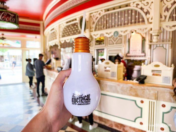 The cup itself looks like a lightbulb and says “Disneyland Main Street Electrical Parade 50th Anniversary” on it! And we haven’t even told you the best part…it lights up!
