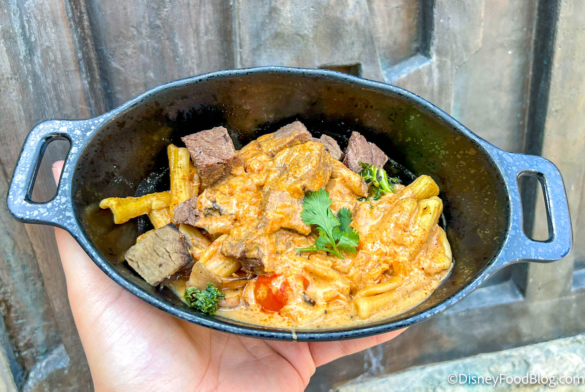 During our trip, we stopped by Docking Bay 7 Food and Cargo to try the NEW Ishi Tib-style Pasta with Braised Beef Bantha. This dish is made with beef pot roast, coconut curry sauce, pasta, and mixed vegetables for $18.99 (Magic Key discount applies). Almost $20?! That’s quite the hefty price for Bantha beef pasta. So…is it worth it?