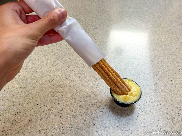 In reality though, this is a bit of a churro TRICK on Disney’s part. Why? Well the churro itself isn’t flavored! It’s really just a classic churro (not flavored to anything unique) with a Pineapple Tres Leches Dipping Sauce. But hey, this was one trick we were willing to fall for — sometimes a great sauce can really elevate a classic treat to something new, so we had to give it a try!
