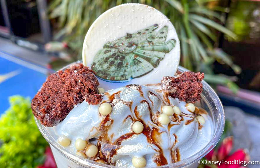 Pineapple Lanai at Disney’s Polynesian Village Resort has a returning frozen Star Wars-inspired treat that’s only available today! The Millennium Falcon Star Wars Soft Serve Sundae is $5.99, and it’s kind of a lot. This space sundae is made with galactic gray vanilla soft-serve with chocolate cream cookie crumbles, chocolate drizzle, white chocolate pearl stars, brownie asteroid pieces with stardust sparkles, and a Millennium Falcon chocolate accent piece (PHEW).