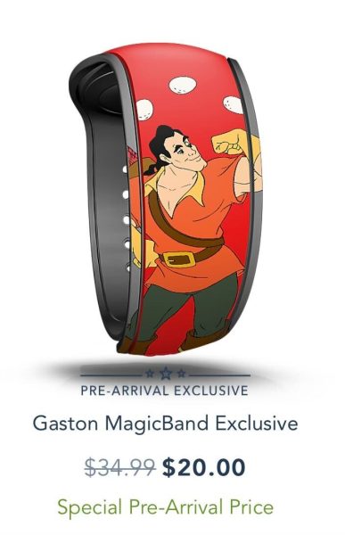First up is this Gaston MagicBand, which is a red MagicBand that shows Gaston flexes his muscles (so I guess that’s what happens when you eat 5 dozen eggs a day). This magic band is $20 for resort guests and passholders to purchase it ahead of time.