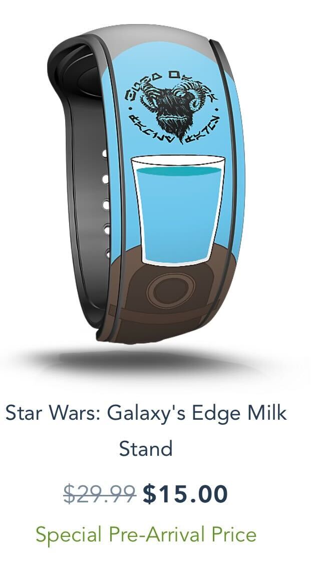 And finally, we have this MagicBand that’s all about the Milk Stand in Star Wars: Galaxy’s Edge in Hollywood Studios! It features the logo of the Milk Stand, along with a refreshing cup of Blue Milk. This is the cheapest of the four new MagicBands at only $15 for resort guests and passholders.