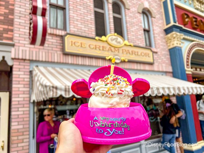 Guests who are looking to celebrate their birthday (or UNbirthday!) in Disneyland Park now have a new option that’s both a treat AND a birthday present! The Celebration Sundae can be found over at Gibson Girl Ice Cream Parlor.