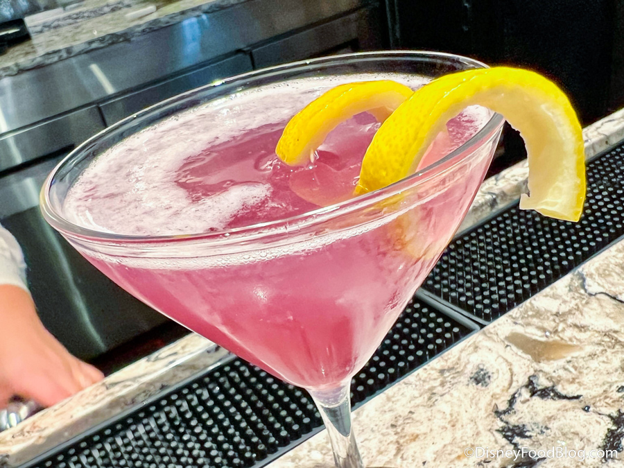 The liquor actually changes in the tone of its purple color according to what you mix it with! The gin on its own is more violet, but because this one is mixed with lemon juice and rosé champagne, it looks more magenta.