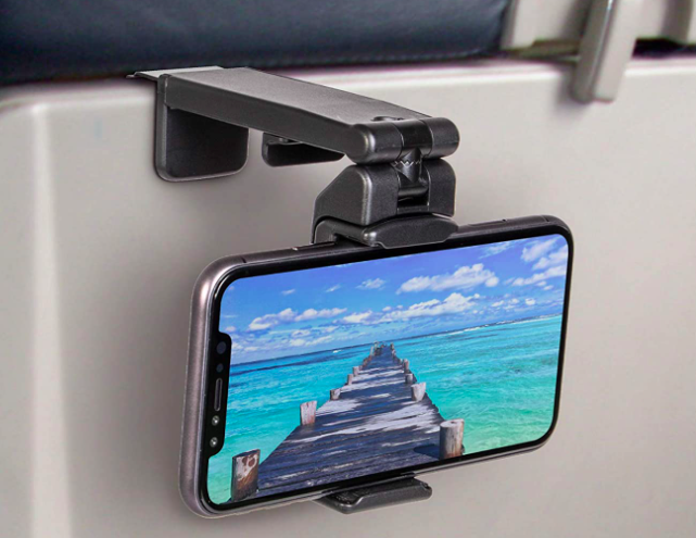 If your plane doesn’t have built-in screens (most planes used for shorter flights don’t), then you can provide your own with a phone mount. This mount can attach to the fold-down trays and securely hold your phone while you enjoy your show.