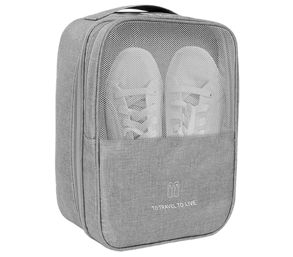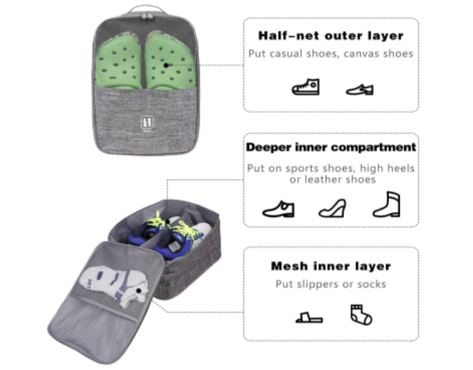 It has 1 big compartment for a pair of bulkier shoes and 2 smaller compartments for sandals or flip-flops.