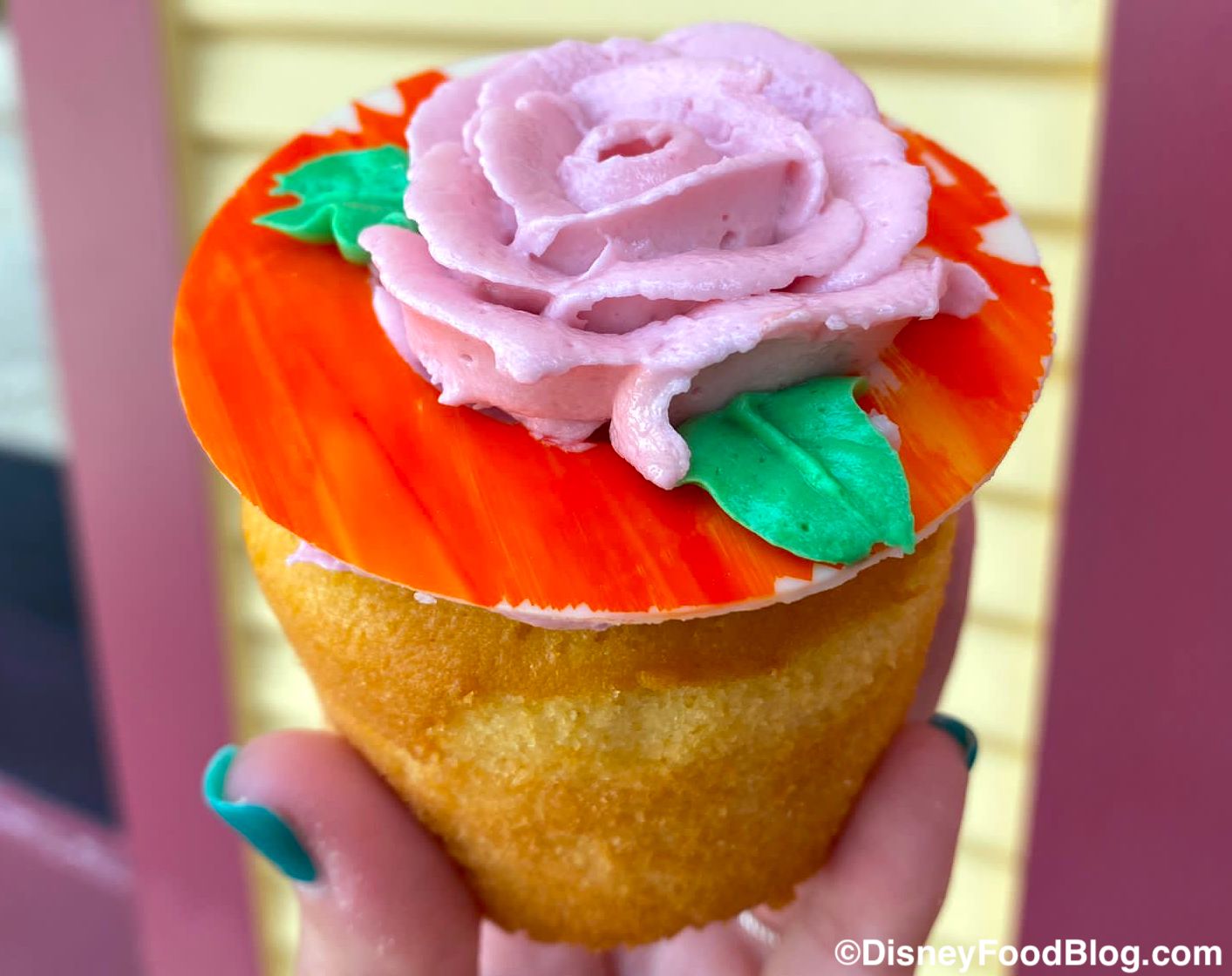 Disney describes this treat as a rose-scented cupcake filled with strawberry rose mousse and topped with strawberry buttercream and white chocolate decor.