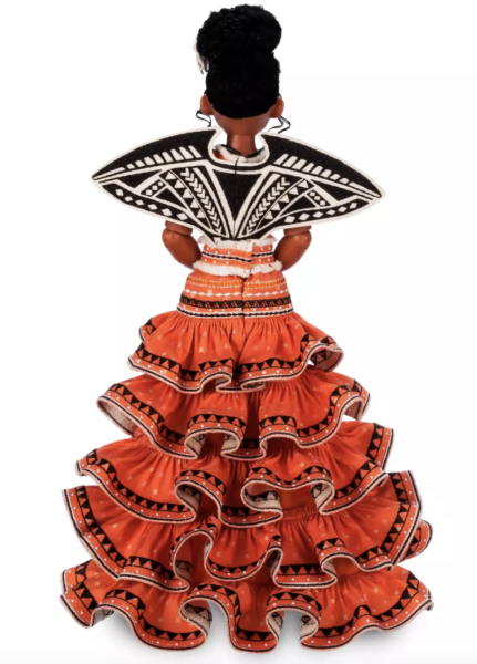 Instead of the normal two-piece outfit we’re used to seeing her in, Moana is wearing a detailed couture gown, which has a five layer ruffled skirt with embroidered, fringed and sequined trims in her signature orange color palette. The back has Tapa print ”wings” attached.