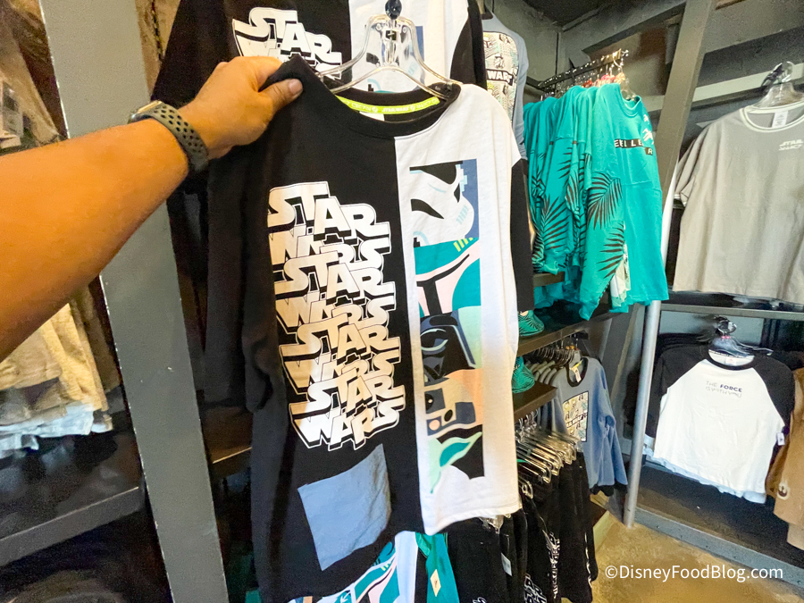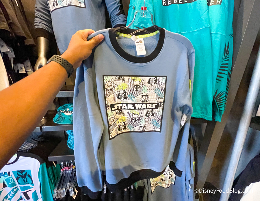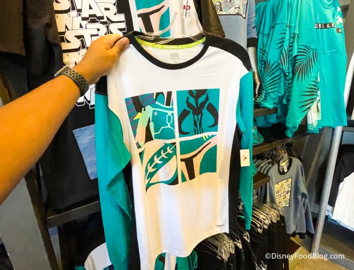 It seems like teal is the theme amongst a lot of the new merchandise, because we spotted this shirt that’s all about Boba Fett and leans heavily into the teal. This shirt is $44.99.